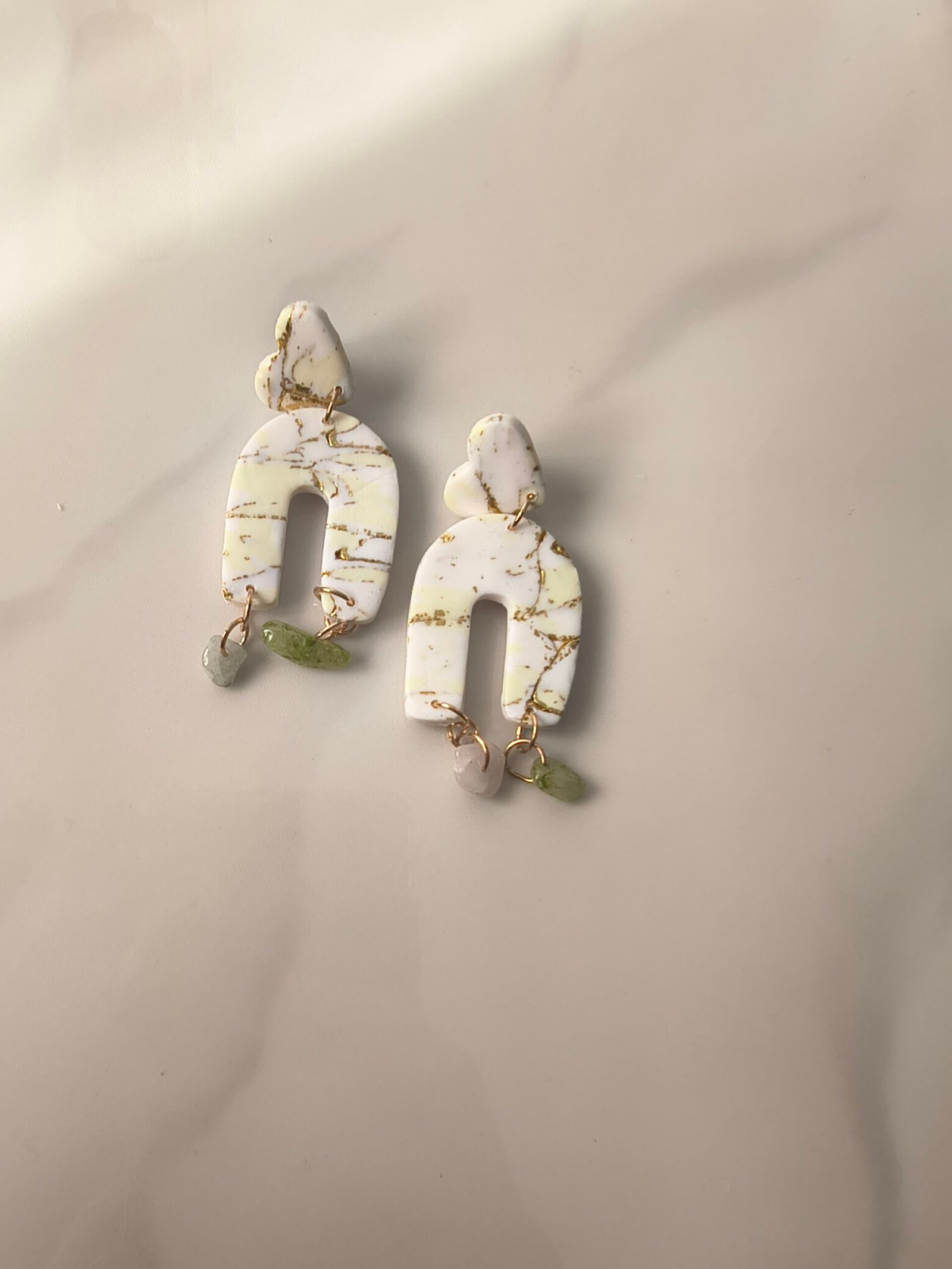 Pendientes Adriana con estampado de mármol, con corazón y con piedras de colores al final del pendiente. Pendientes hechos de arcilla polimérica, a mano y con mucho amor.
