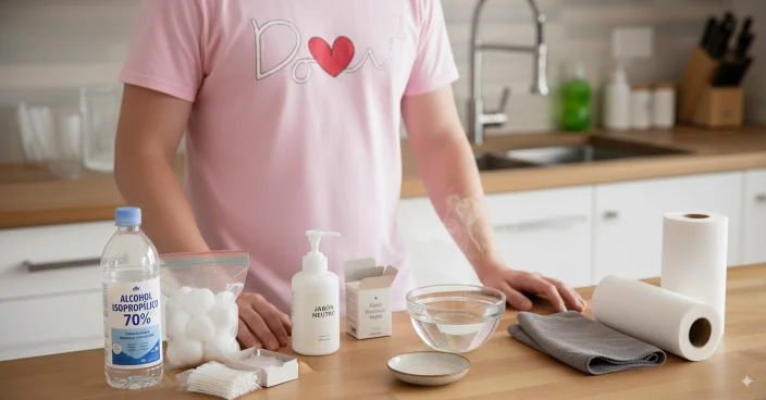 3. Limpieza previa de restos visibles. Si ves suciedad (polvo, crema, maquillaje), limpia con agua tibia y unas gotas de jabón neutro. Usa un bastoncillo para zonas estrechas (roscas, bisagras). Aclara bien. Este paso es clave: el alcohol desinfecta mejor cuando la superficie está limpia.